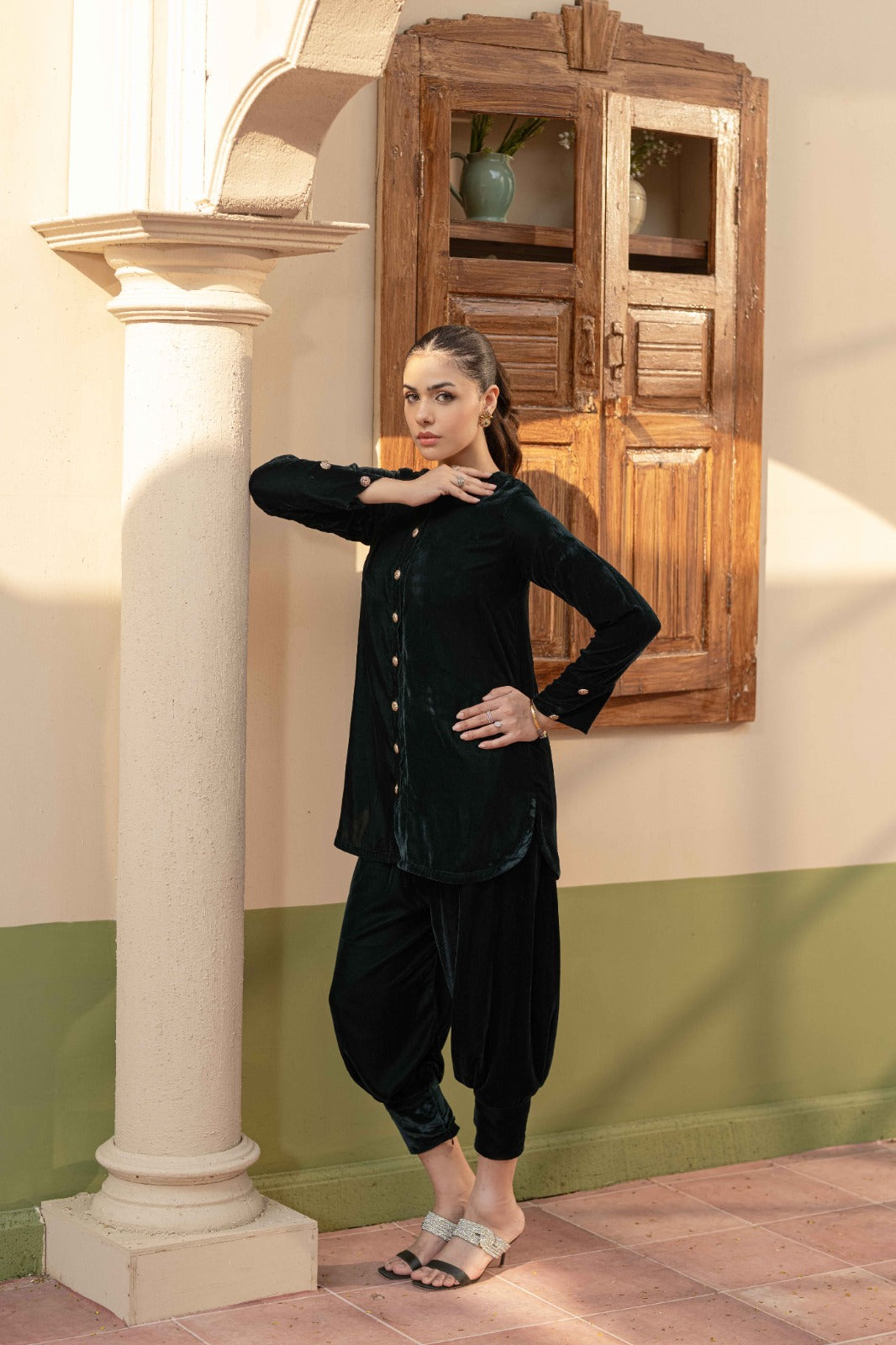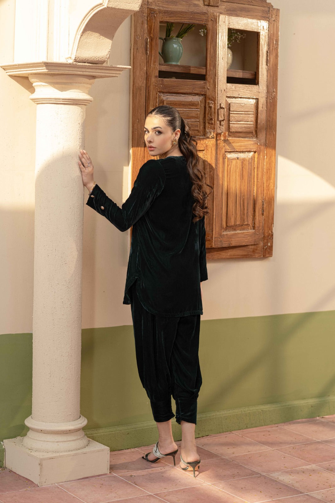 Velvet hues of deep emerald embrace intricate embroidery, echoing the grandeur of nature wrapped in sophistication.
