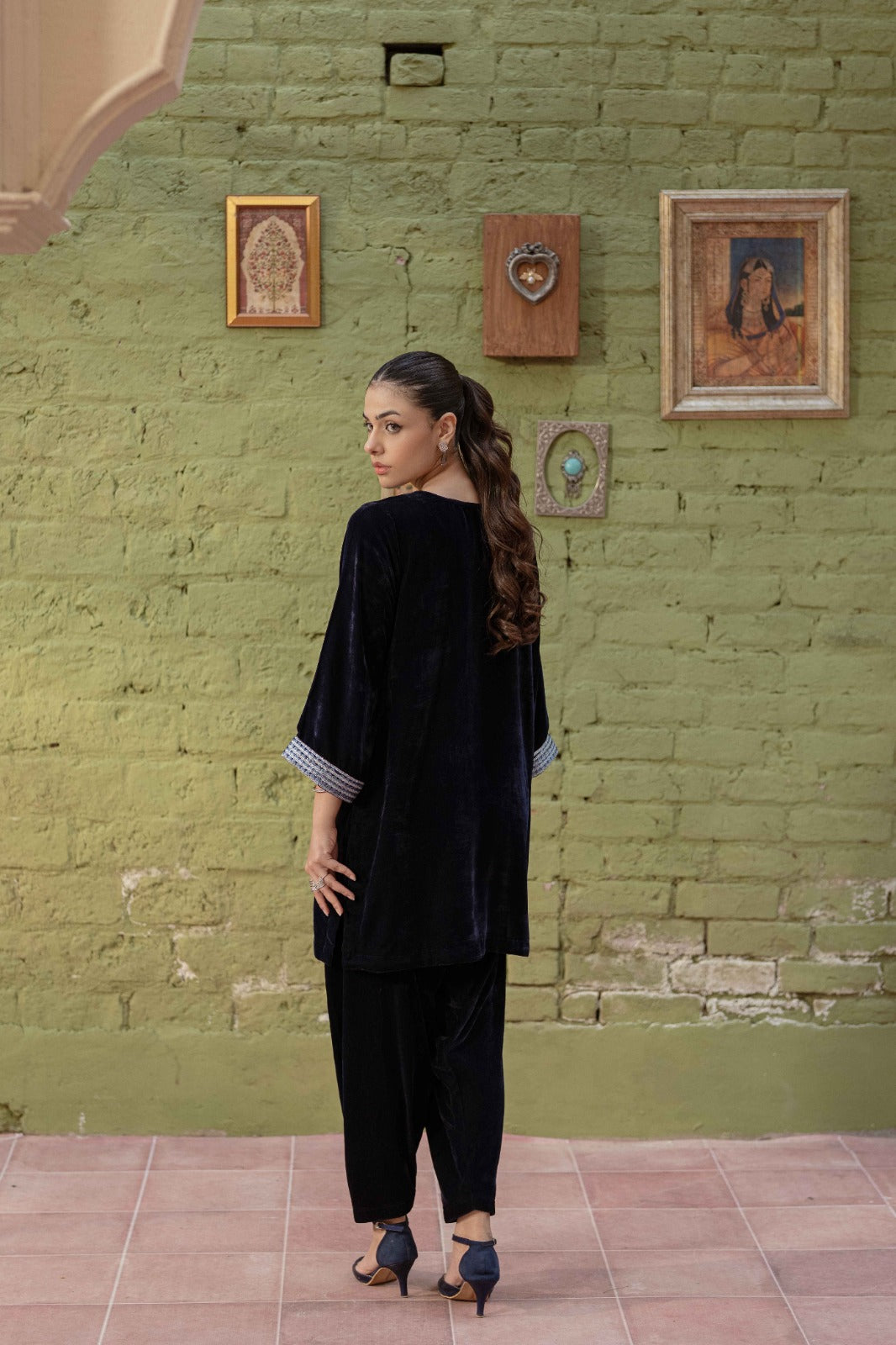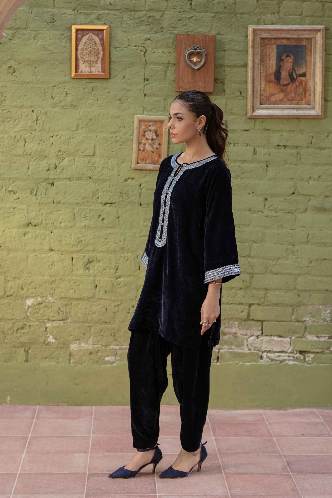 Velvet in a bold midnight blue meets intricate silk thread embroidery,