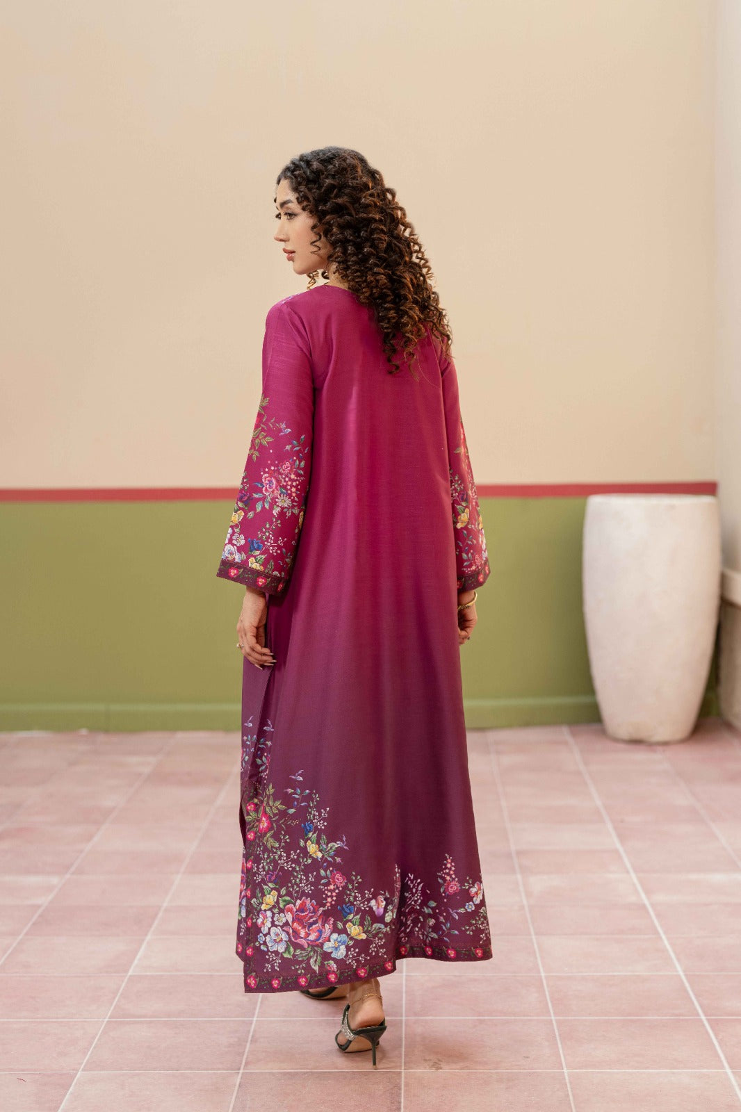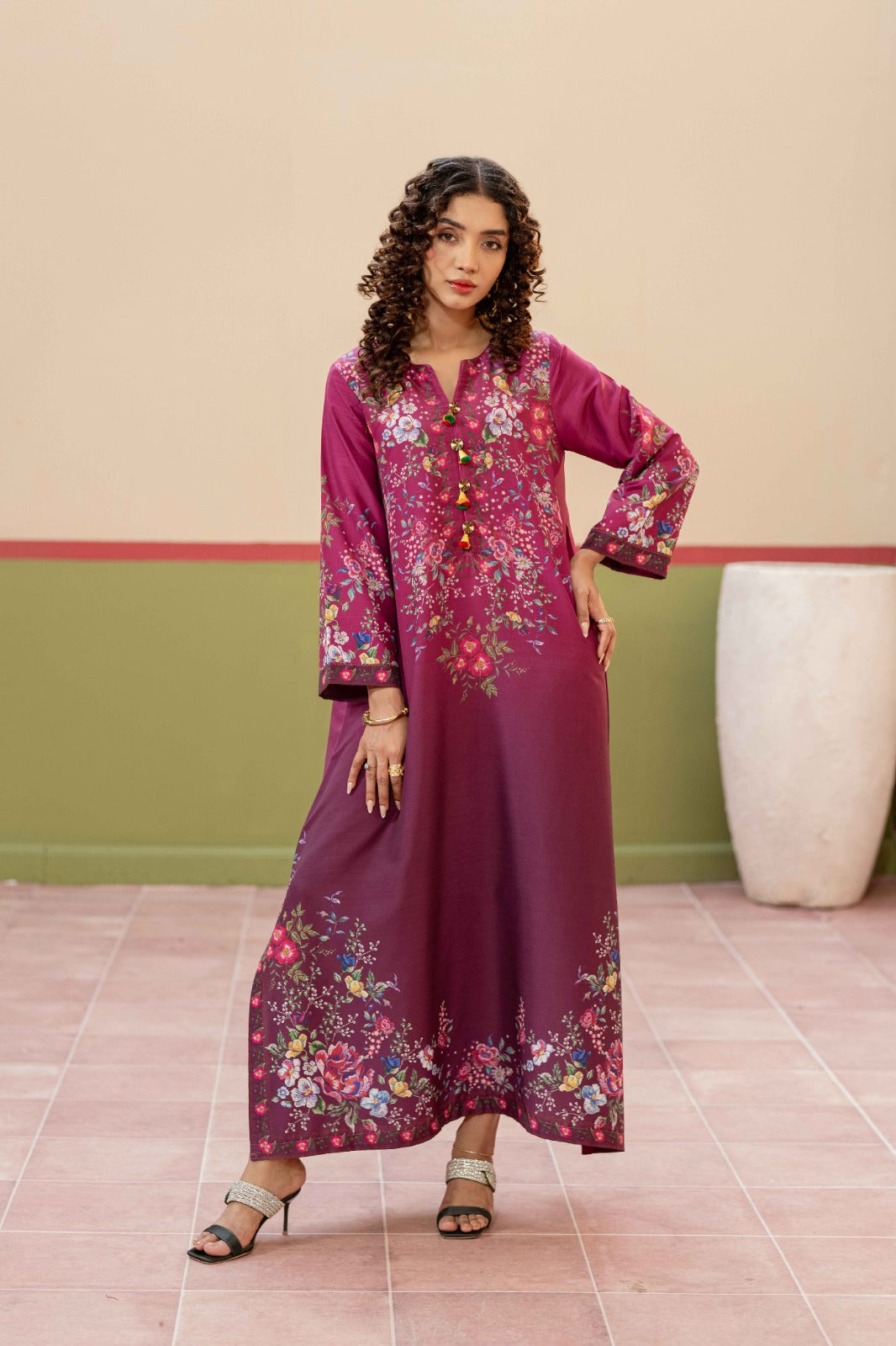 A long kaftan-style shirt adorned with a beautiful floral print.