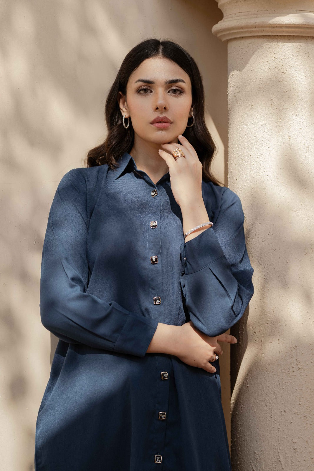 This contemporary shirt showcases a front button placket, blending structure with simplicity.