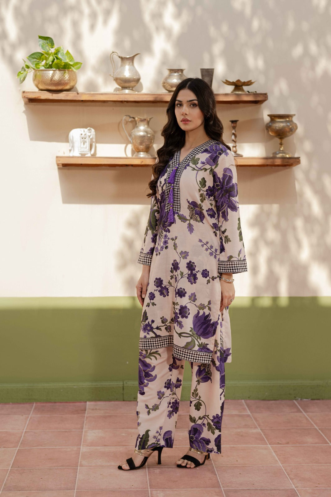 Delicate floral patterns meet modern tailoring in this sophisticated set.
